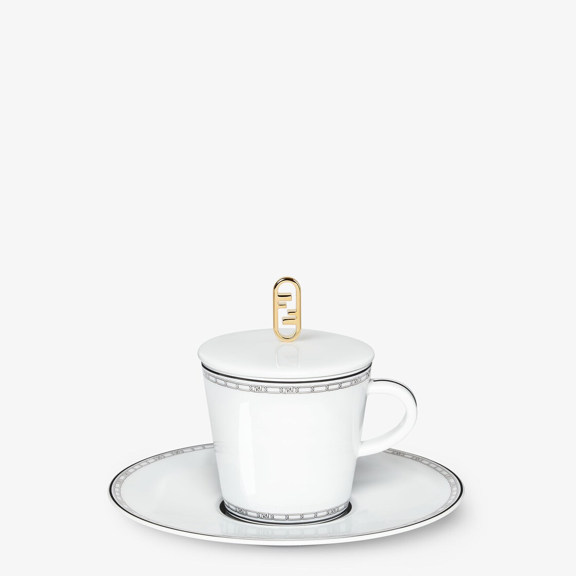 Teacup in the finest Limoges porcelain, with a black Fendi O’Lock Chain motif border. The ritual of tea and coffee has been redesigned by Silvia Venturini Fendi inspired by the brand’s DNA, in a proposal of modern and refined designs, with matching saucers and a lid with gold-coloured F O’Lock knob. A selection of the finest materials enhances the functionality and aesthetics in a harmonious balance of style and timeless elegance.