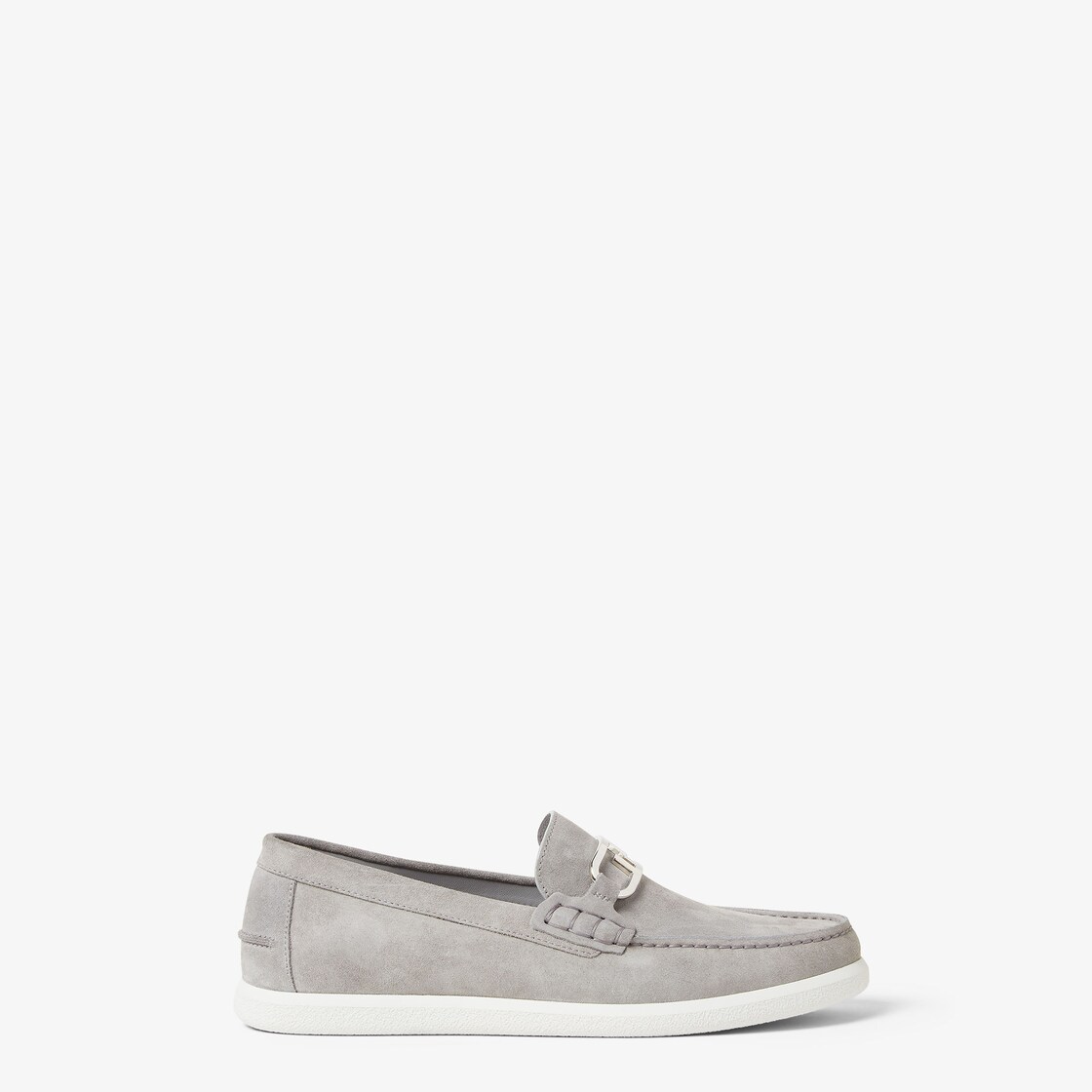 Loafers with flexible white rubber sole and buckle with Fendi O'Lock motif. Made of light grey suede. Palladium-finish metalware.