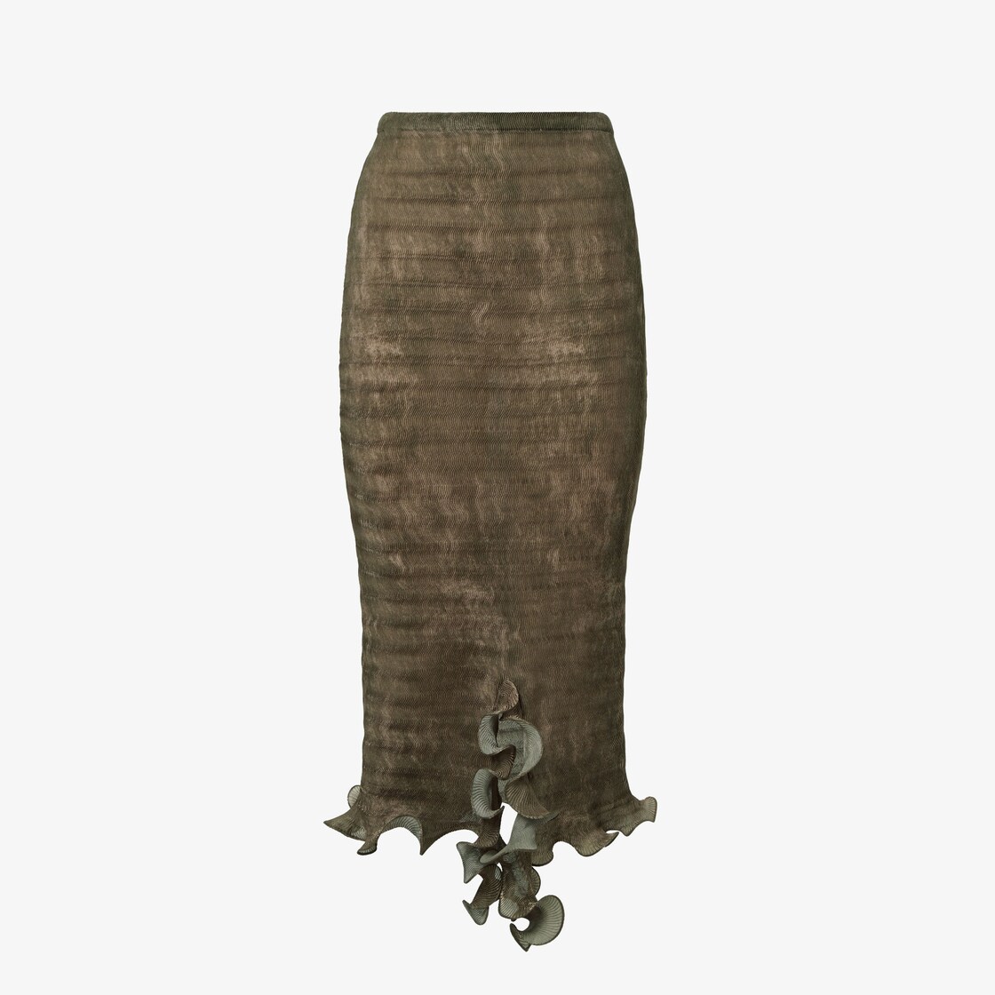 Midi pencil skirt with elasticated waist. Made of pleated fabric with an abstract shaded olive green print. Finished with ruffles on the asymmetrical hem with a small central slit on the front.