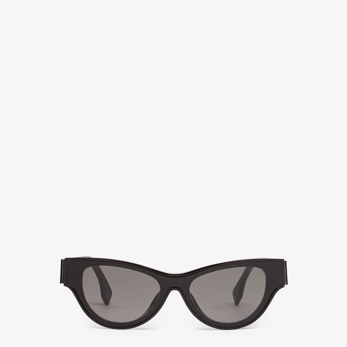 Fendi First cat-eye glasses in black acetate with a wrap-around lens construction. Temples with oversize diagonal F motif in palladium-coloured metal. Grey lenses.