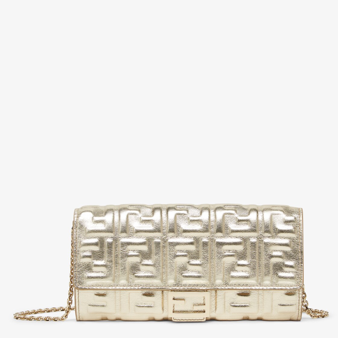 Baguette continental wallet with detachable, thin chain shoulder strap. The interior is laid out like a wallet with two gusseted compartments, a zip pocket, two flat pockets and ten card slots. Made of champagne-coloured metallic calf leather with embossed FF motif. Gold-finish metalware.