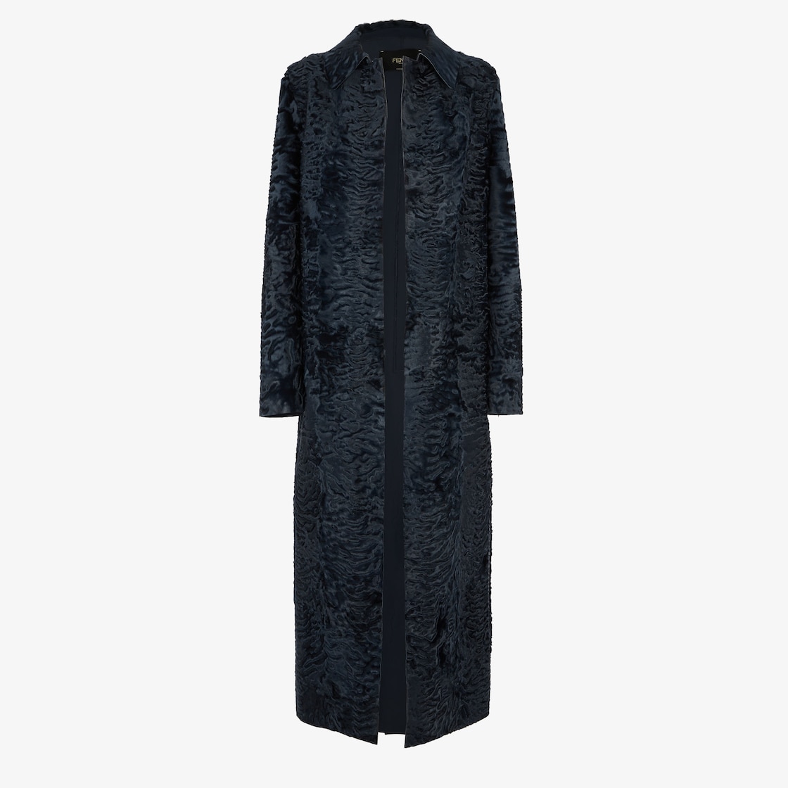 Long-sleeved straight-cut long coat with shirt collar. Style with no closure and back-centre slit. Made of blue Persian lamb swakara fur. Finished with openwork embroidered striped motif along the sides.