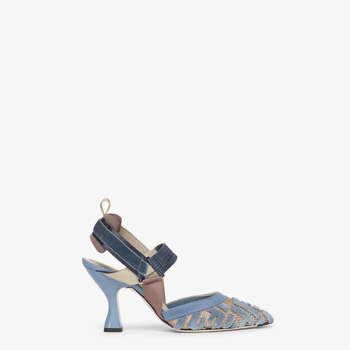 Colibrì slingbacks with elastic ribbons around the foot. The sole is embellished with rubber inserts. Made of mesh with embossed, fringed FF embroidery in light blue. The padded cushion and hiking shoe tab add a sporty touch. Light blue enamelled heel.