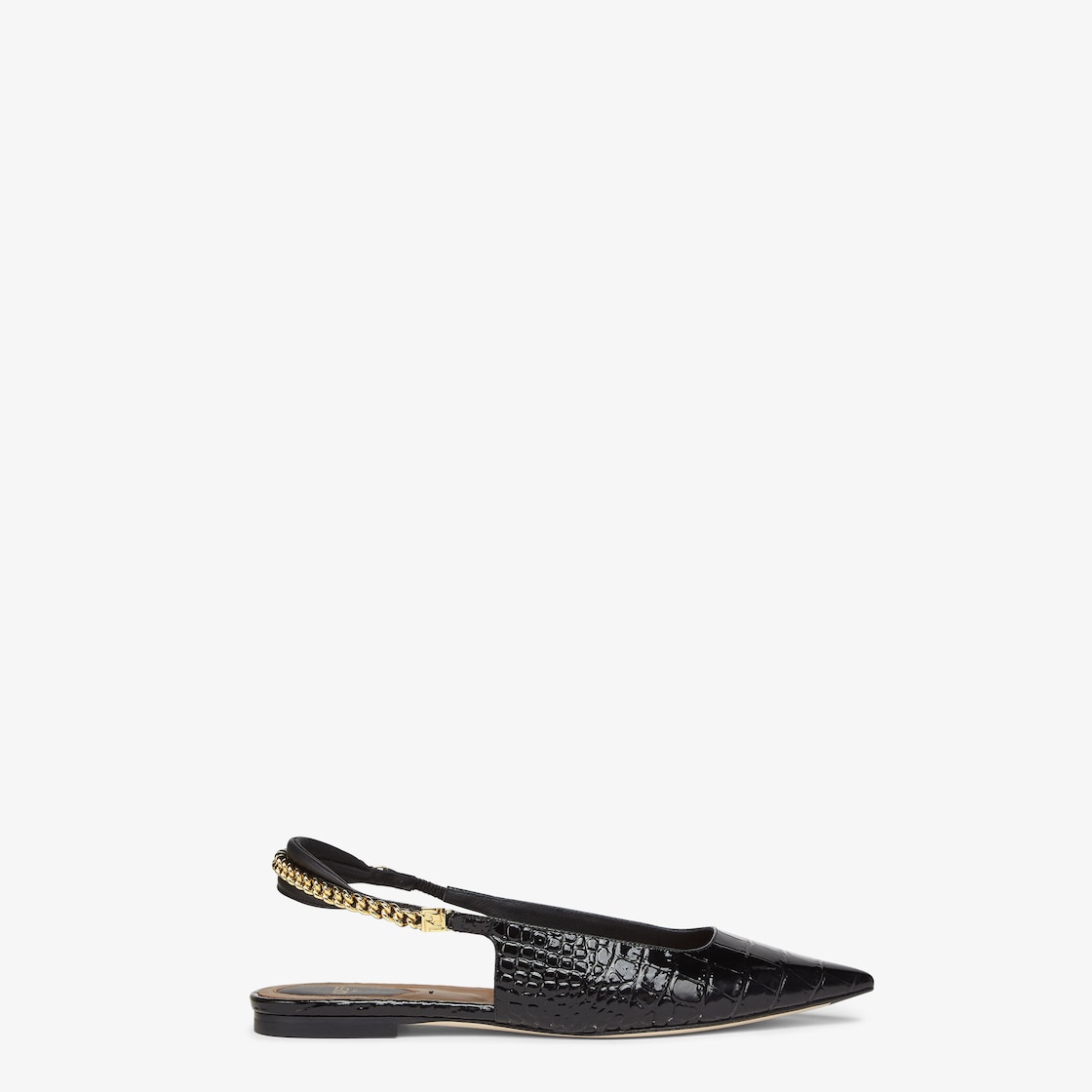 Colibrì Lite slingbacks with a tapered, feminine silhouette, ankle strap and chain detail. The sole is embellished with rubber inserts. Made of shiny, black crocodile-embossed leather. The padded heel cushion adds a sporty feel. Gold-finish metalware.