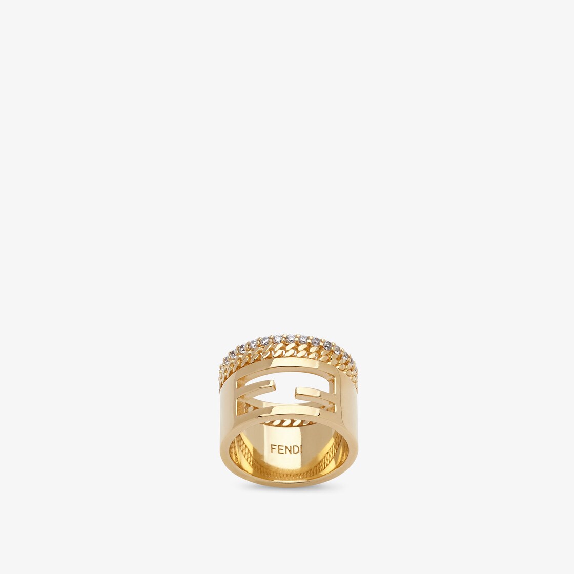 Wide-band ring with FF Baguette logo. Made of metal with a gold finish. Decorated with inlaid details and white crystals.