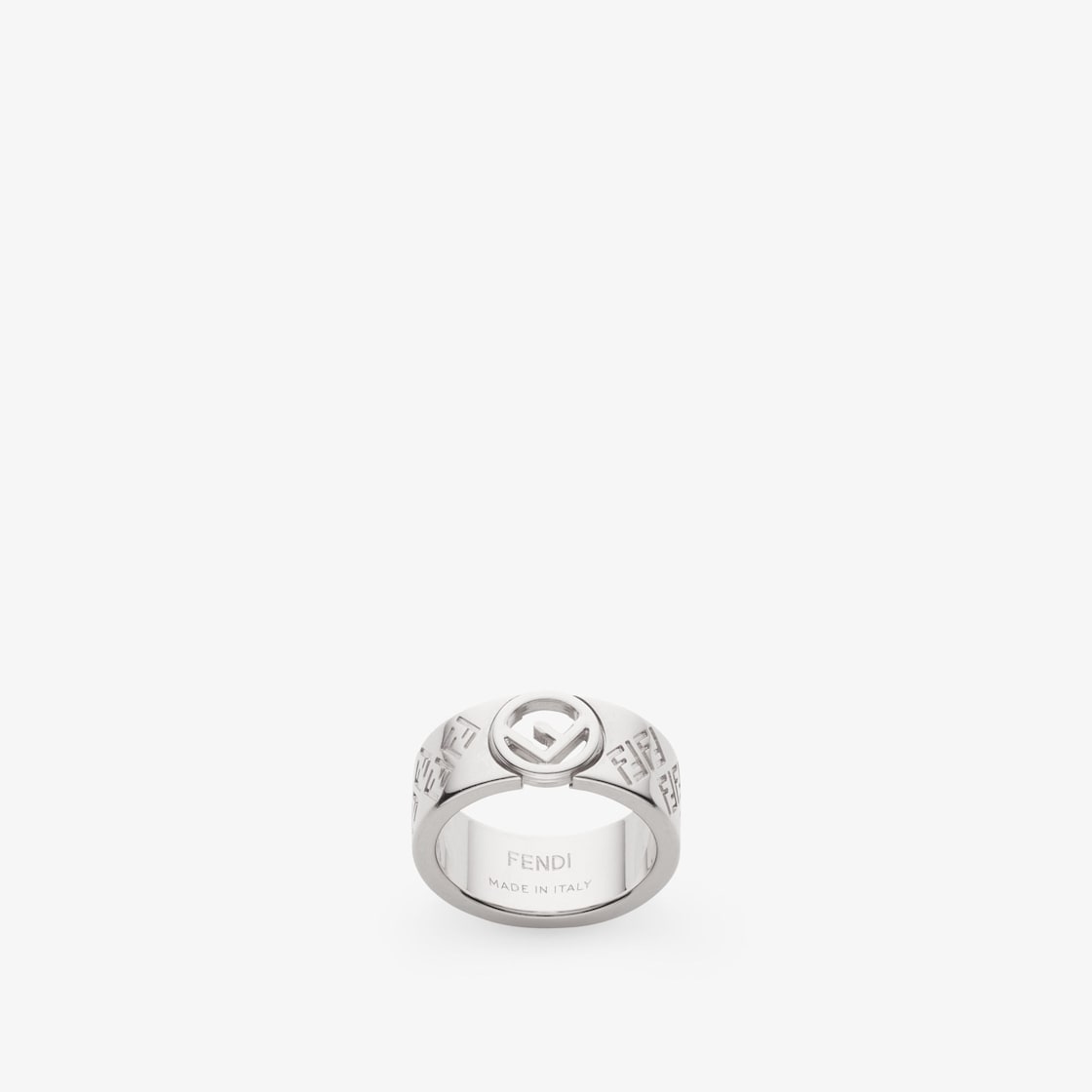Ring with F is Fendi logo detail. Made of palladium-finish metal. Decorated with engraved FF motif.