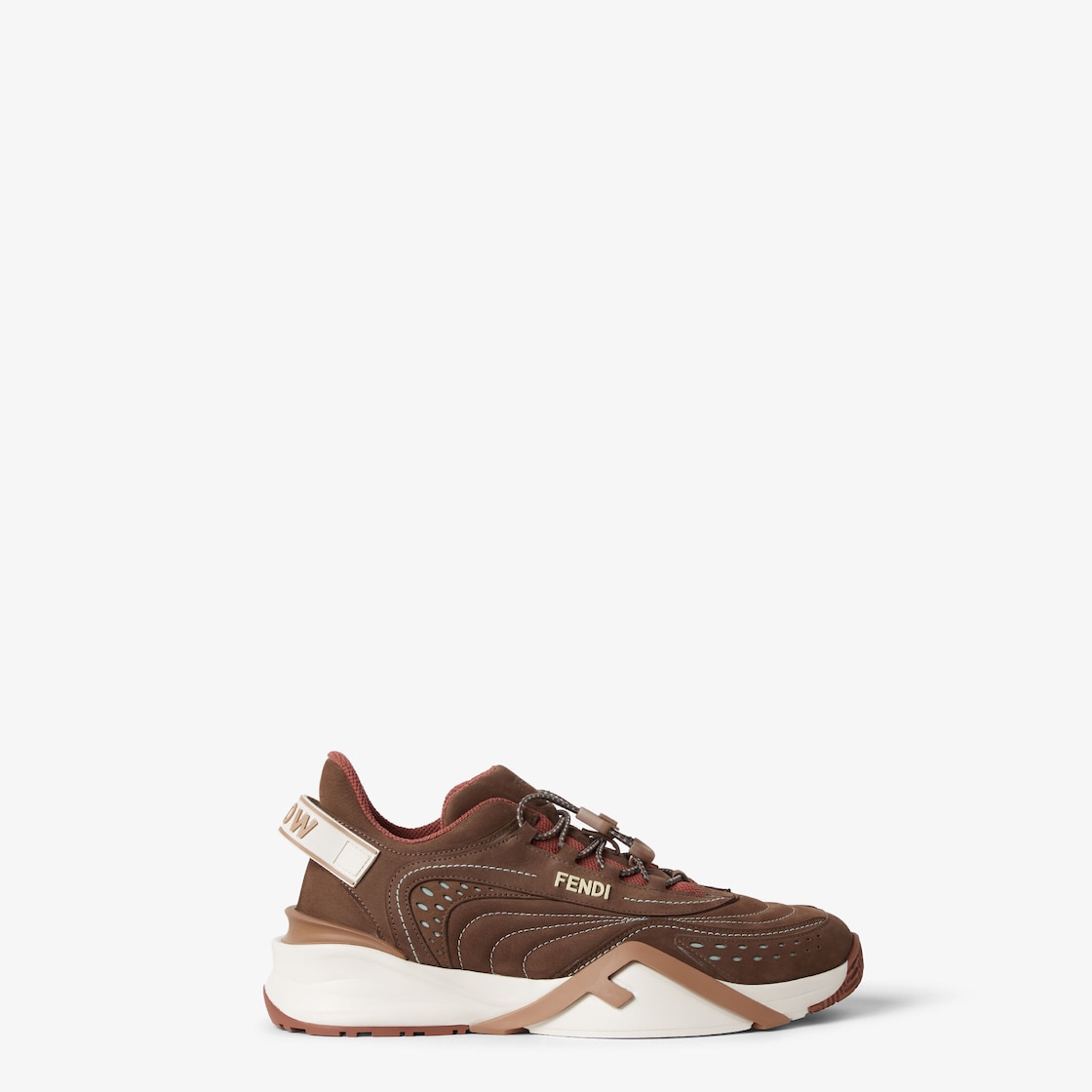 Fendi Flow sneakers with adjustable elastic laces and drawstring fastening. Customised with embossed FF logo on the tongue and rubber tab with embossed logo on the back of the heel. Made of brown nubuck leather with brown technical mesh inserts. Rubber details. 35 mm rubber running sole with light brown diagonal F detail.