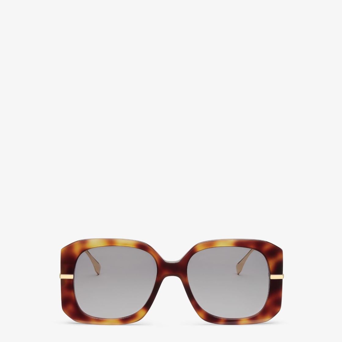 Oversized, square Fendigraphy eyeglasses in Havana acetate, inspired by the Hobo bag. Temples with in-line gold-coloured metal Fendi maxi lettering. Grey gradient lenses.