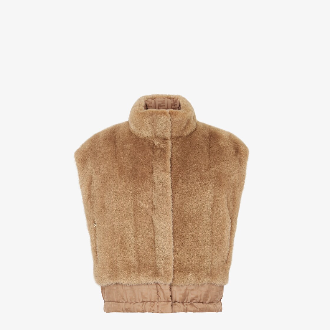 Short reversible waistcoat with high collar and drawstring hem. One side has zip pockets, the other high patch pockets with flap. Concealed fastening. Made of beige-coloured mink. Nylon lining with FF motif in the same colours.
