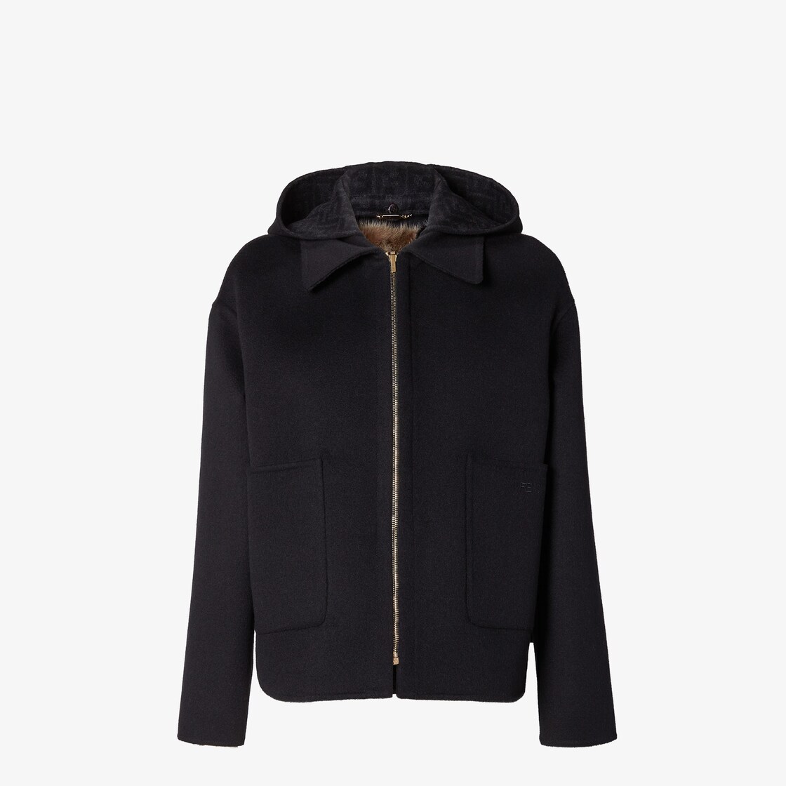 Short blouson with shirt collar and detachable hood. Oversized volume with low-set sleeves and side welt pockets. Asymmetric hem longer at the back. Zip fastening. Made in a beige wool double fabric. Lining customised with all-over FF motif. Featuring a detachable gilet in mink inlaid with the FF motif in black and orange. The fur part is created using archive furs, reworked through an artisanal process that renews existing materials.