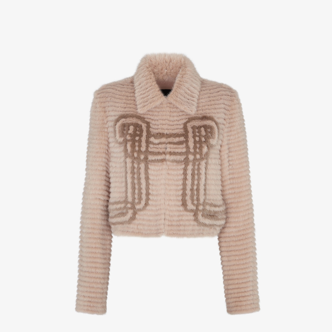 Short jacket with shirt collar and long sleeves. Concealed front fastening. Made of light brown mink with Liberty motif inlaid on the front and back waist in a contrasting colour. The special Featherlike technique makes the garment extremely light to wear.