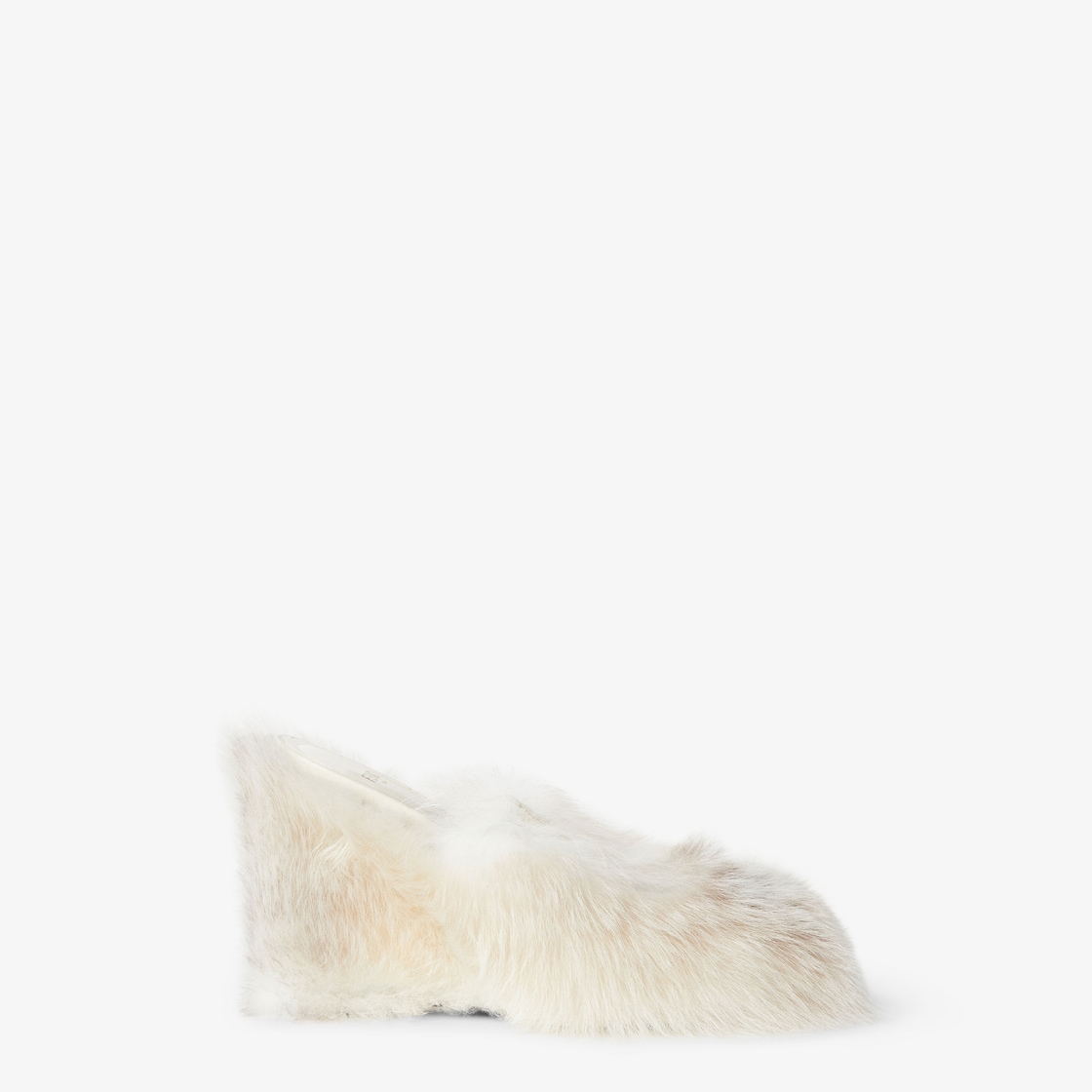 Wraparound peep-toe sandals with wedge heel featuring the iconic contoured Arco motif. Made of white ‘dorsato’ shearling, characterised by a trompe-l'œil effect that mimics the full, velvety texture of fox fur. Details and insole in tone-on-tone leather.