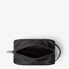 Trousse de toilette zippée format moyen. En nylon FF rembourré de couleur noire, à la texture brillante et légèrement en relief. Poignée en cuir de veau lisse noir. Doublure en tissu lavable. Garnitures en métal avec finition ruthénium satiné.