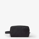 Trousse de toilette zippée petit format. En nylon FF rembourré de couleur noire, à la texture brillante et légèrement en relief. Poignée en cuir de veau lisse noir. Doublure en tissu lavable. Garnitures en métal avec finition ruthénium satiné.