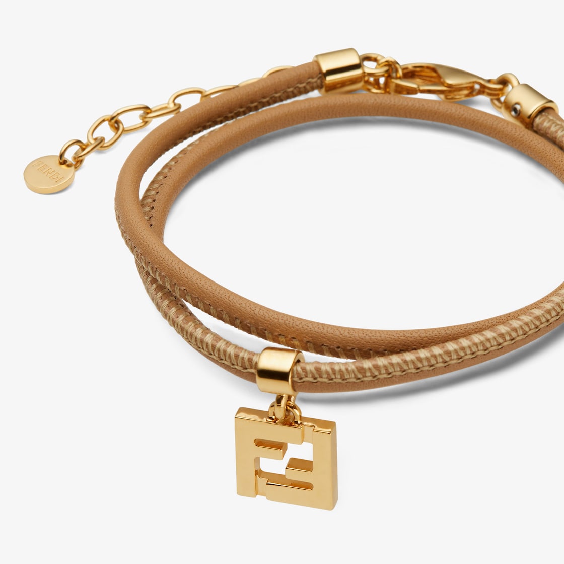 Bracelet double tour avec bijou FF. Fermoir réglable avec mousqueton et médaillon à logo. En cuir nappa tubulaire couleur camel. Détails en métal finition dorée.