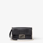 Pochette Mamma Baguette avec rabat souple, ornée du fermoir FF avec détail en cuir ton sur ton. Intérieur doublé. La dragonne en cuir et la bandoulière amovible en chaîne permettent de le porter à la main ou à l’épaule. En cuir nappa noir souple. Garnitures en métal finition dorée.