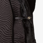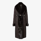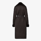 Manteau mi-long oversize avec col à revers et manches longues à emmanchures basses. Poches latérales passepoilées et ceinture assortie en cuir avec boucle FF en métal. En satin noir avec motif matelassé de vagues all-over. Détails en vison noir au col, aux poignets et sur le devant.