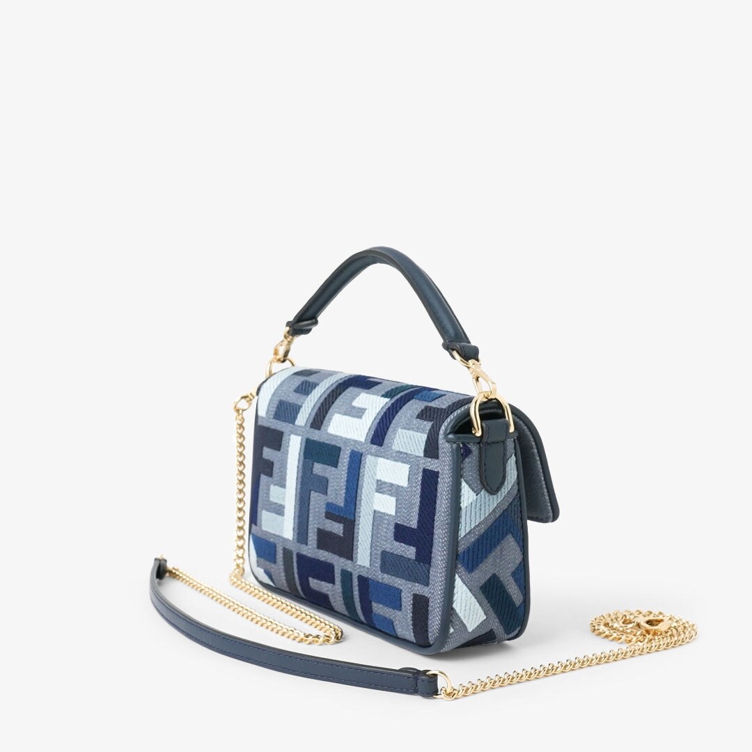 Sac iconique Baguette® petit format, réalisé en toile bleue avec motif FF brodé en relief en fil dans les tons bleus et fermoir FF. Finitions avec détails en cuir ton sur ton.