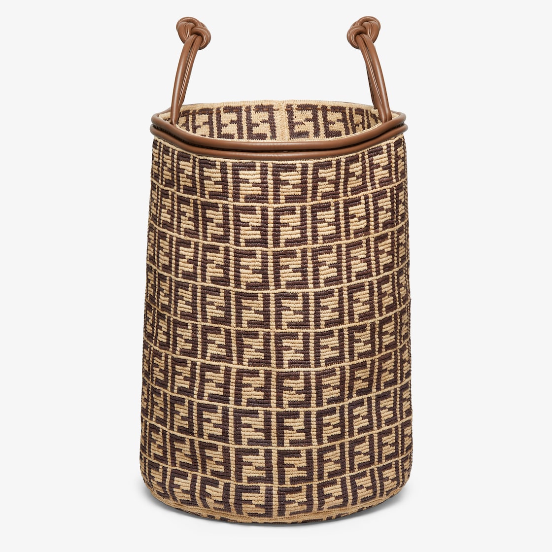 Panier cylindrique, réalisé par Fendi et Made For A Woman, marque malgache socialement responsable, membre de la World Fair Trade Organization (WFTO). Le panier est tressé à la main par Made For A Woman avec du raphia de provenance locale, travaillé au crochet pour créer une série de nœuds enchevêtrés dessinant le logo FF emblématique de Fendi. Finition avec poignées tubulaires en cuir marron clair avec motif noué, inspiré du défilé de mode AH24. La confection artisanale fait de chaque article Made For A Woman une pièce unique : les légères différences observées par rapport au modèle photographié sont des caractéristiques précieuses qui distinguent l’article.