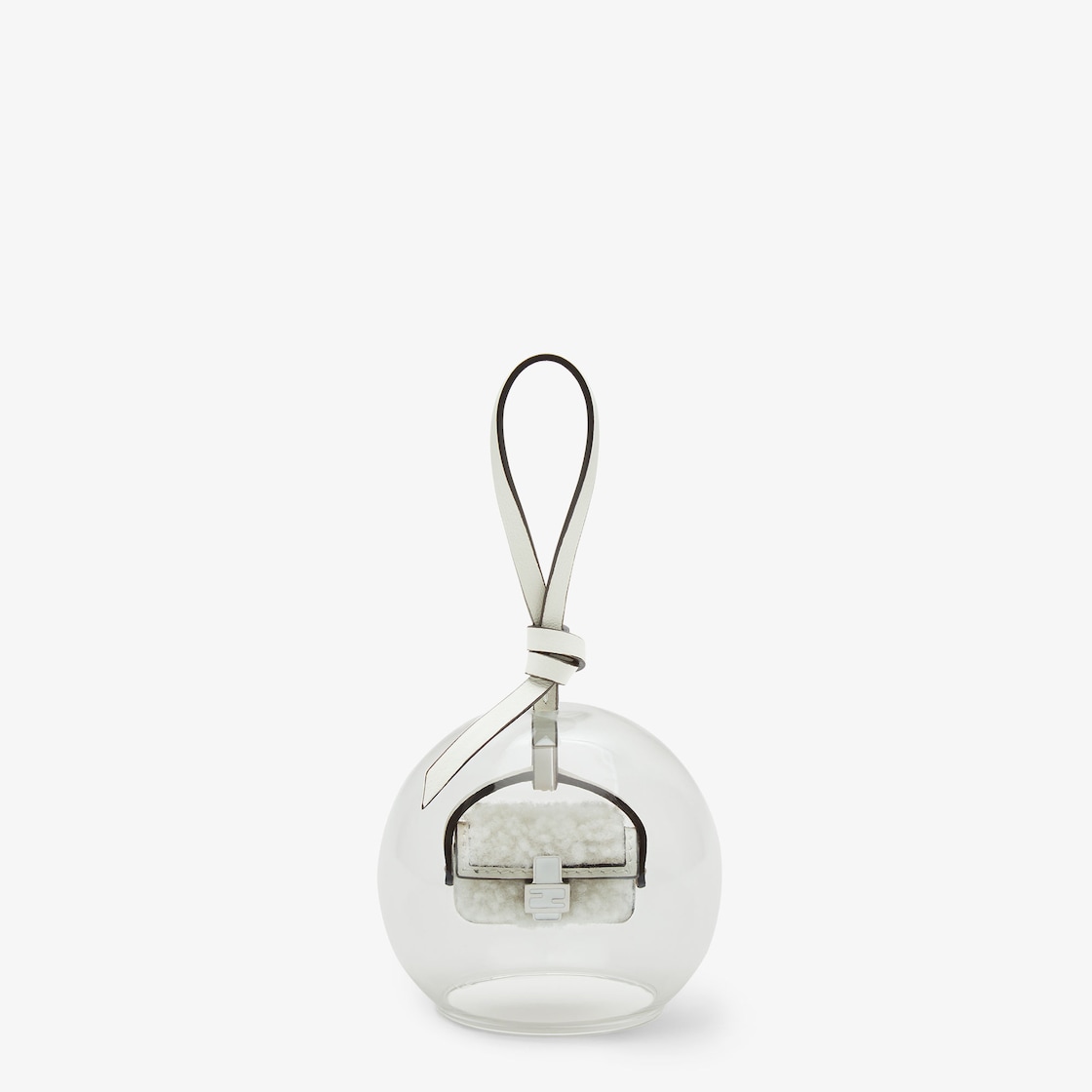 Boule de Noël en verre transparent avec lanière en cuir blanc. Elle renferme une miniature du sac Baguette iconique de Fendi en peau de mouton blanc orné du fermoir FF en métal finition palladium.