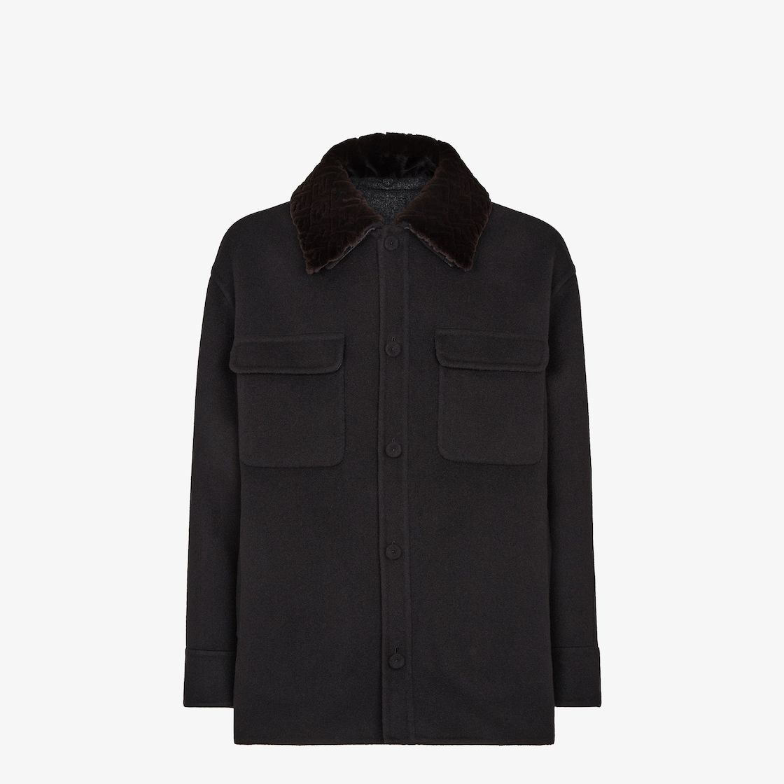 Veste Go-To Jacket à simple boutonnage et coupe droite, avec col chemise et manches longues à emmanchures basses avec poignets. Deux poches poitrine avec rabat et poches latérales. Fermeture boutonnée. En cachemire double noir avec intérieur contrasté dans les tons gris. Double petit col amovible en peau de mouton noire, façonné avec FF à effet 3D. Écusson Fendi Roma en cuir noir à l’arrière du col.