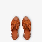 حذاء بشريط مطاطي خلفي، ومقدّمة لوزية الشكل، ورباط مطاطي ناعم، وشريط مزدوج يلتف على شكل ربطة فراشة.مصنوع من جلد النابا (nappa) اللامع باللون البني الفاتح.كعب عالٍ منحوت ومكسو بجلد النابا (nappa) بدرجات مختلفة من اللون نفسه، مع شريط معدني باللون الذهبي محفور بعلامة Fendi.
