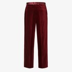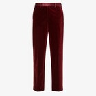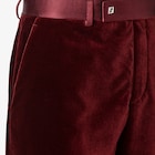 سروال بقصّة ضيقة مع جيوب جانبية وجيوب مخفية في الجهة الخلفية.حلقات حزام على الخصر وطيّة سروال.إغلاق بسحاب ومشبك مخفيين.العرض عند الطرف: 22 سم.مصنوع من مُخمل القطن باللون العنّابي.مزيّن بشريط خصر من الساتان (satin) بدرجات مختلفة من اللون نفسه مع شعار FF مايكرو معدني بلمسة نهائية من البلاديوم (palladium) على الخصر يضفي مظهر الزر.