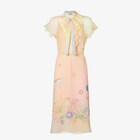 فستان متوسط الطول بخصر ضيّق.رقبة مستقيمة مع ربطات على الجهة الأمامية وأكمام قصيرة مزيّنة بكشكشة.إغلاق بأزرار حتى الخصر وسحّاب على الجانب الأيسر.مبطّن بلون متناسق.التصميم جزء من المجموعة الموسمية "Fantastic Fendi Future" المصمّمة بالتعاون مع الفنانة اليابانية آيا تاكانو، وهو مصنوع من حرير الشيفون (chiffon) مع طبعة Fantastic Flowers باللونين الوردي والأصفر.