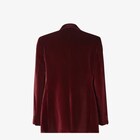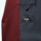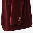 بليزر مفصّل بصف أزرار واحد.جيب في الجهة الأمامية وجيبان مخفيان على الجانبين.فتحة في وسط الجهة الخلفية.إغلاق في الجهة الأمامية مع زر مزدوج.مبطّن.مصنوع من مُخمل القطن قصير الوبر باللون العنّابي.مزين بطيّات من الحرير بدرجات مختلفة من اللون نفسه.بطانة مع طباعة FF مايكرو بلون متباين.