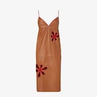 فستان سهل الارتداء برقبة على شكل حرف V وأحزمة كتف رفيعة.فتحة في منتصف الظهر وإغلاق بسحاب على الجانب الأيسر.غير مبطن.مصنوع من جلد النابا (nappa) الناعم باللون البني مع علامة Fendi Ajour، ومزيّن بأطراف باللون الأحمر المتباين.تنشئ التفاصيل المفرّغة وتلاعب الخامات تأثيراً بصرياً قوياً ثلاثي الأبعاد.