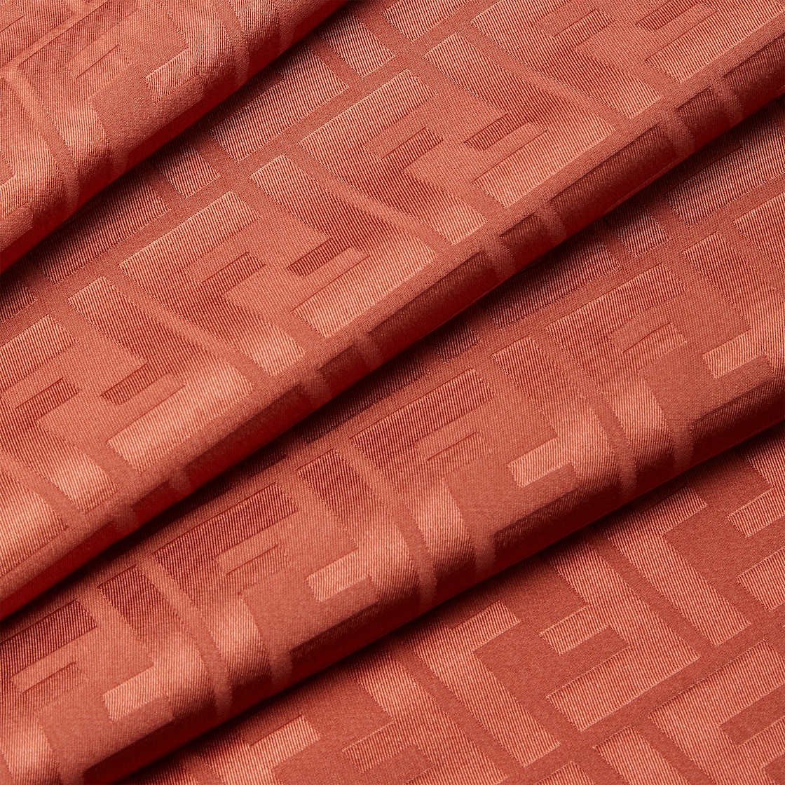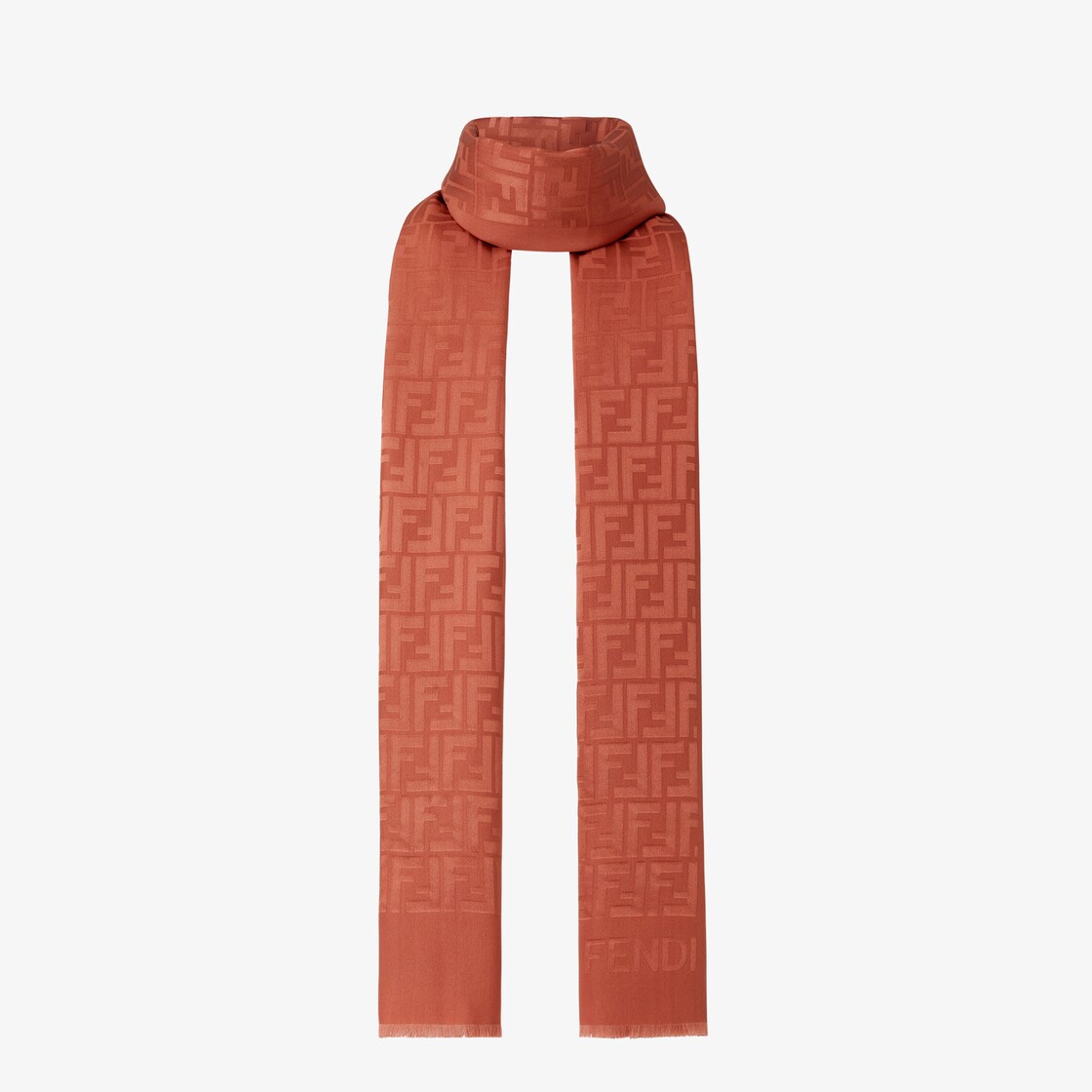 شال عريض مستطيل وكبير الحجم مصنوع من الحرير الطبيعي باللون البني البرتقالي.علامة FF من الجاكار عليه بالكامل.أطراف بأهداب يدوية.