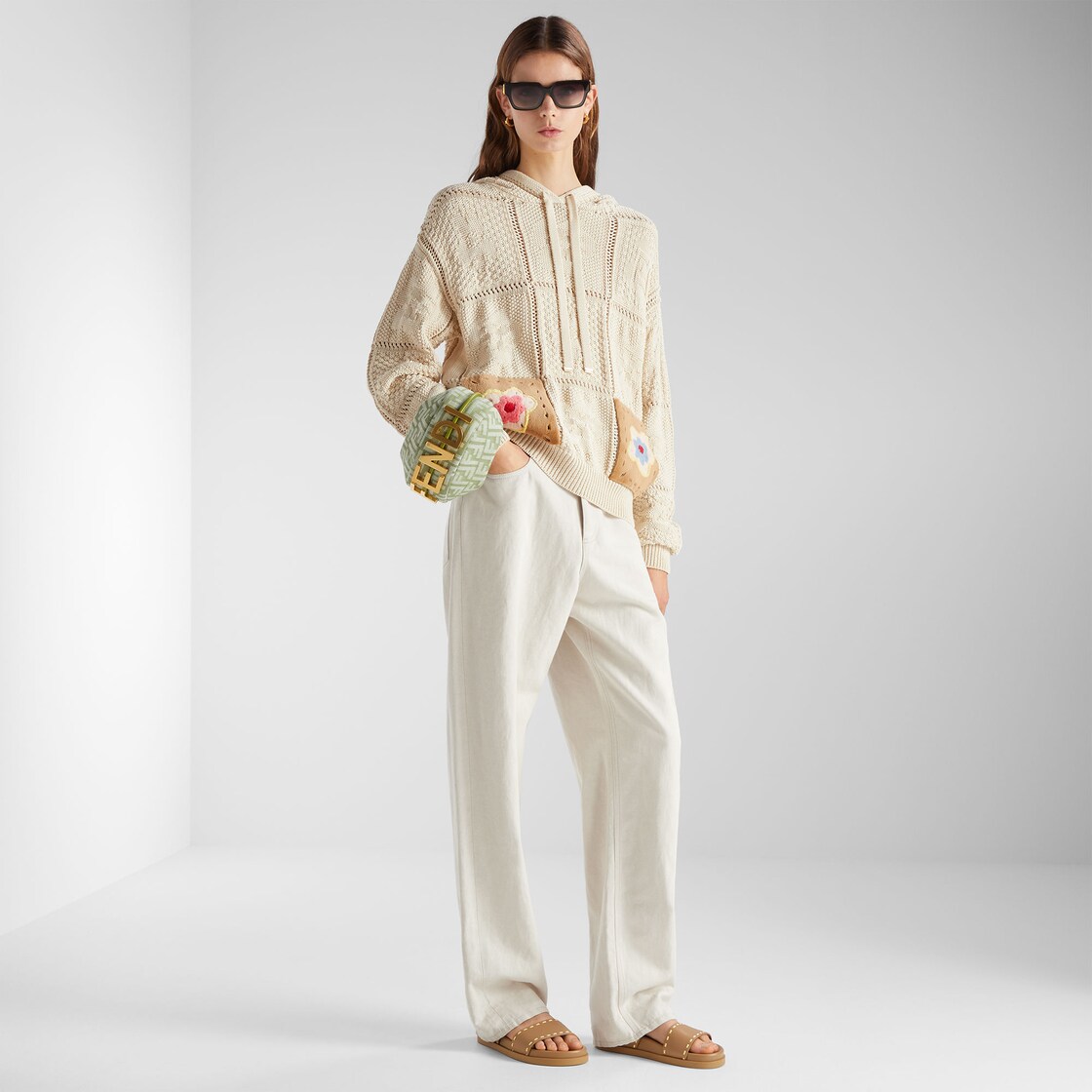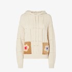 كنزة بأكمام طويلة وقلنسوة.أطراف الأكمام والطرف بتصميم مضلّع.مصنوعة من نسيج قطني باللون الوردي الفاتح، ومُصمّمة بالكامل بحبكة كروشيه.مُزيّنة بجيوب Sunny Side Flowers من المنك (mink) على الطرف بالألوان البيج، والوردي، والأزرق الفاتح.