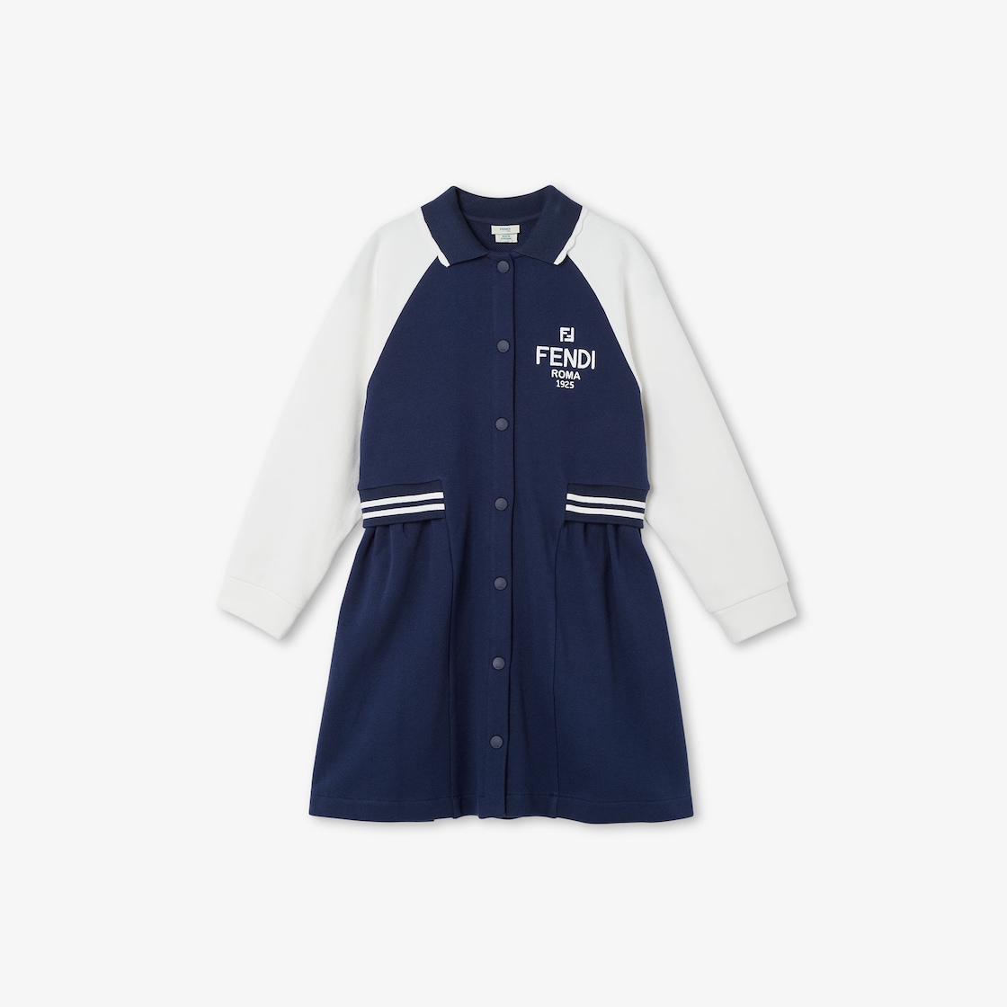 فستان للأطفال من الصوف الناعم باللون الأزرق مع أكمام باللون الأبيض. رقبة مخططة، وخصر مطاطي، وعلامة Fendi مطرزة في الجهة الأمامية.