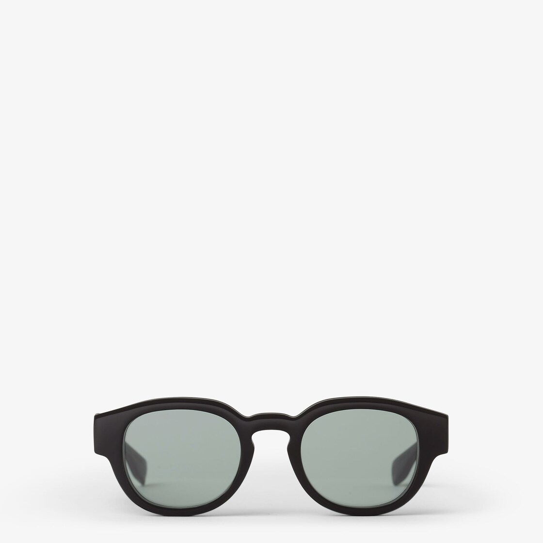 نظارات دائرية من الأسيتات (acetate) باللون الأسود. الذراعان مزيّنان بحروف FENDI منقّشة بدرجات مختلفة من اللون نفسه. عدسات باللون الأخضر.