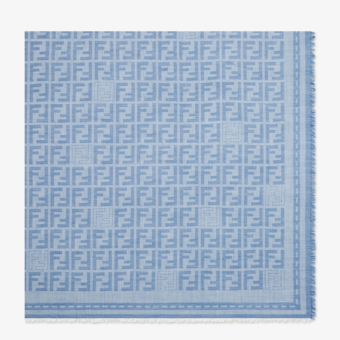 شال كبير مصنوع من الصوف الناعم فائق الخفة بلون الدنيم الأزرق. يرسم الجاكار البديع علامة FF عليه بالكامل. مزين بتفاصيل والإطار مستوحى من درزات Selleria. أطراف مع أهداب. مناسب لكل الفصول.