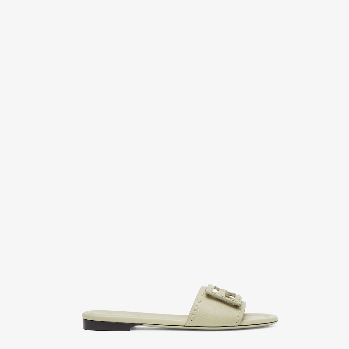 صندل بشريط عريض. مصنوع من جلد العجل كويو رومانو (Cuoio Romano) باللون الأخضر مع درزات يدوية علوية كبيرة بدرجات مختلفة من اللون نفسه، رمز لدرزات Selleria الأيقونية المتوارثة عبر أجيال من حرفيي فندي منذ عام 1925. علامة FF Baguette بدرجات مختلفة من اللون نفسه.