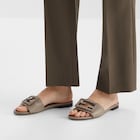 صندل بشريط عريض. مصنوع من الجلد بملمس مميز باللون الرمادي الفاتح، ومزين بدرزات يدوية علوية كبيرة بدرجات مختلفة من اللون نفسه، رمز لدرزات Selleria الأيقونية المتوارثة عبر أجيال من حرفيي فندي منذ عام 1925. علامة FF Baguette بدرجات مختلفة من اللون نفسه.