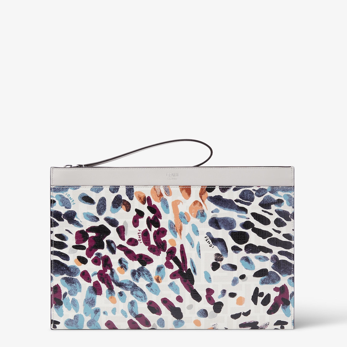 Medium-sized flat pouch with zip. Made of white FF Canvas with multicolour, low-sheen Fendi Falena print. Dark grey leather details. Palladium-finish metalware.