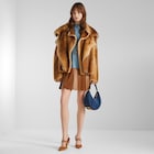Short shirt dress with shirt collar and long sleeves. Breast pocket. Waistline seam and pleated skirt. Visible front button fastening. Made in light blue silk poplin and brown nappa leather creating a double layer effect.