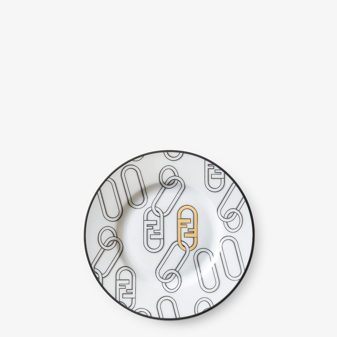 Set consisting of two bread plates in the finest Limoges porcelain, decorated with the all-over Fendi O'Lock Chain motif. Designed exclusively for the tableware line, they come in white and black with gold-coloured accents. In her conception of the new Fendi Casa universe, Silvia Venturini Fendi redesigns the collection accessories drawing inspiration from the fashion house’s DNA. Italian design is expressed in the choice of quality materials, functionality and aesthetics in a harmonious balance of style and timeless elegance.