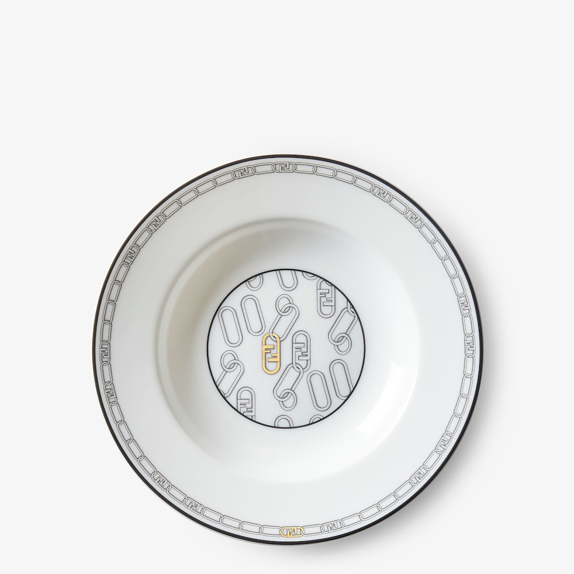 Set consisting of two soup plates in the finest Limoges porcelain, decorated with the Fendi O'Lock Chain motif on the edge and centre. Designed exclusively for the tableware line, they come in white and black with gold-coloured accents. In her conception of the new Fendi Casa universe, Silvia Venturini Fendi redesigns the collection accessories drawing inspiration from the fashion house’s DNA. Italian design is expressed in the choice of quality materials, functionality and aesthetics in a harmonious balance of style and timeless elegance.