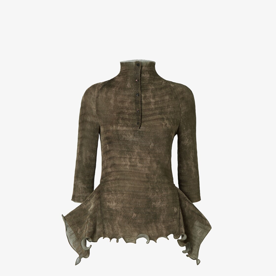 Figure-hugging jumper with a high collar and 3/4 sleeves. Polo collar closure with mother-of-pearl buttons. Made of pleated fabric with an abstract shaded olive green print. Finished with ruffles on the asymmetrical hem.