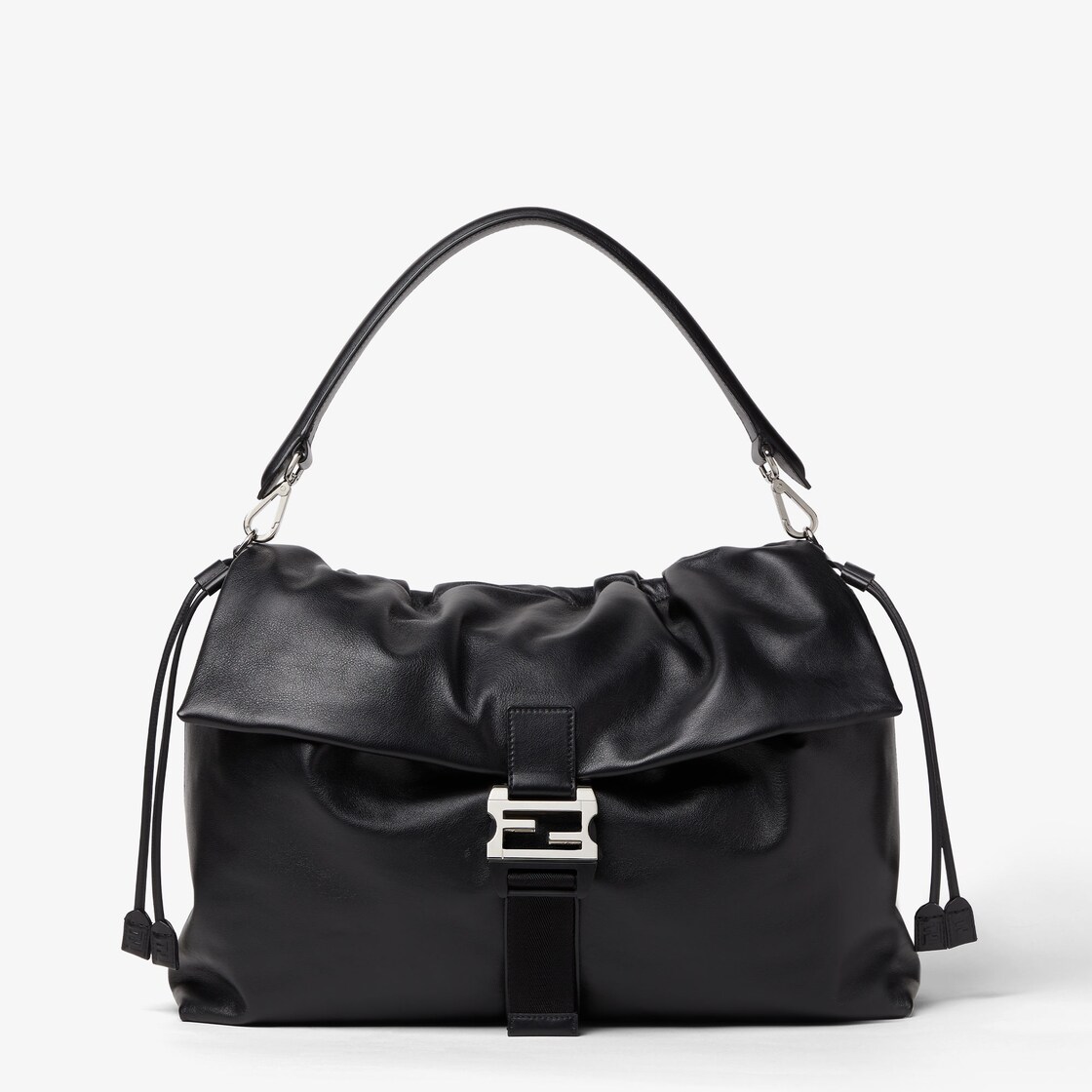 Maxi Fendi Flux messenger bag with a soft, deconstructed look, made of smooth, black calf leather. Flap with metal FF clasp buckle and drawstring with customised, tone-on-tone leather cords.