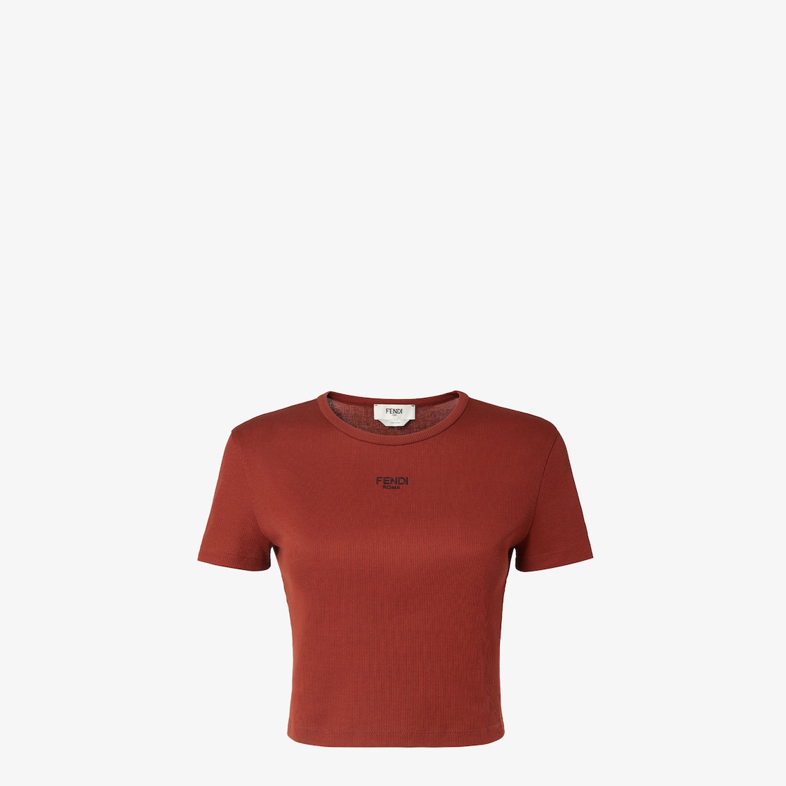 Cropped slim-fitting top with crew neck and short sleeves. Made of rust-coloured cotton jersey with a rib knit. Customised with a small contrasting Fendi Roma logo embroidered on the front.