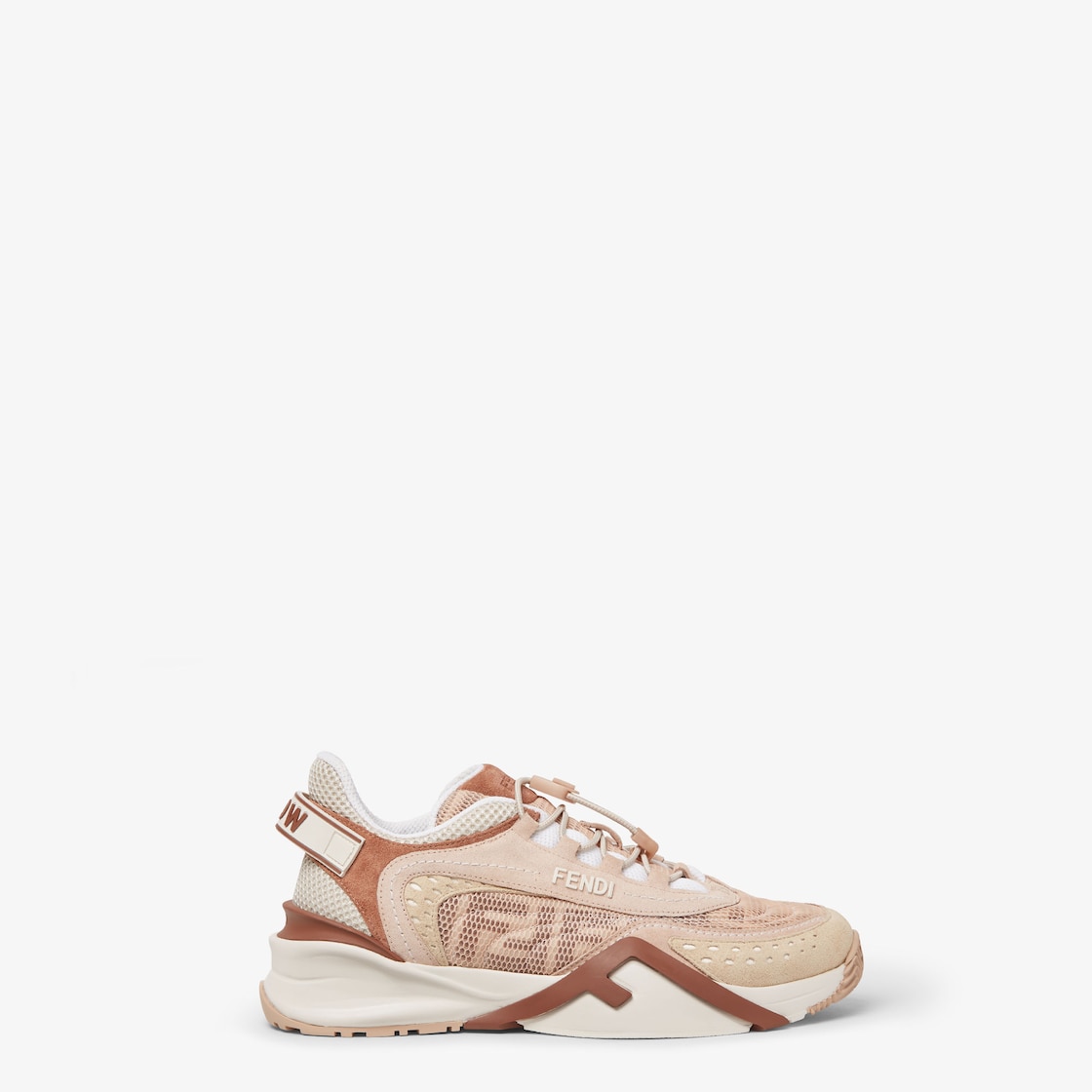 Fendi Flow sneakers with adjustable elastic laces and drawstring fastening. Customised with suede label and embossed FF on the tongue and rubber tab with embossed logo on the back of the heel. Made of pink tech mesh with suede and leather inserts in pink and burgundy. Rubber details. 35 mm rubber running sole with burgundy diagonal F detail.