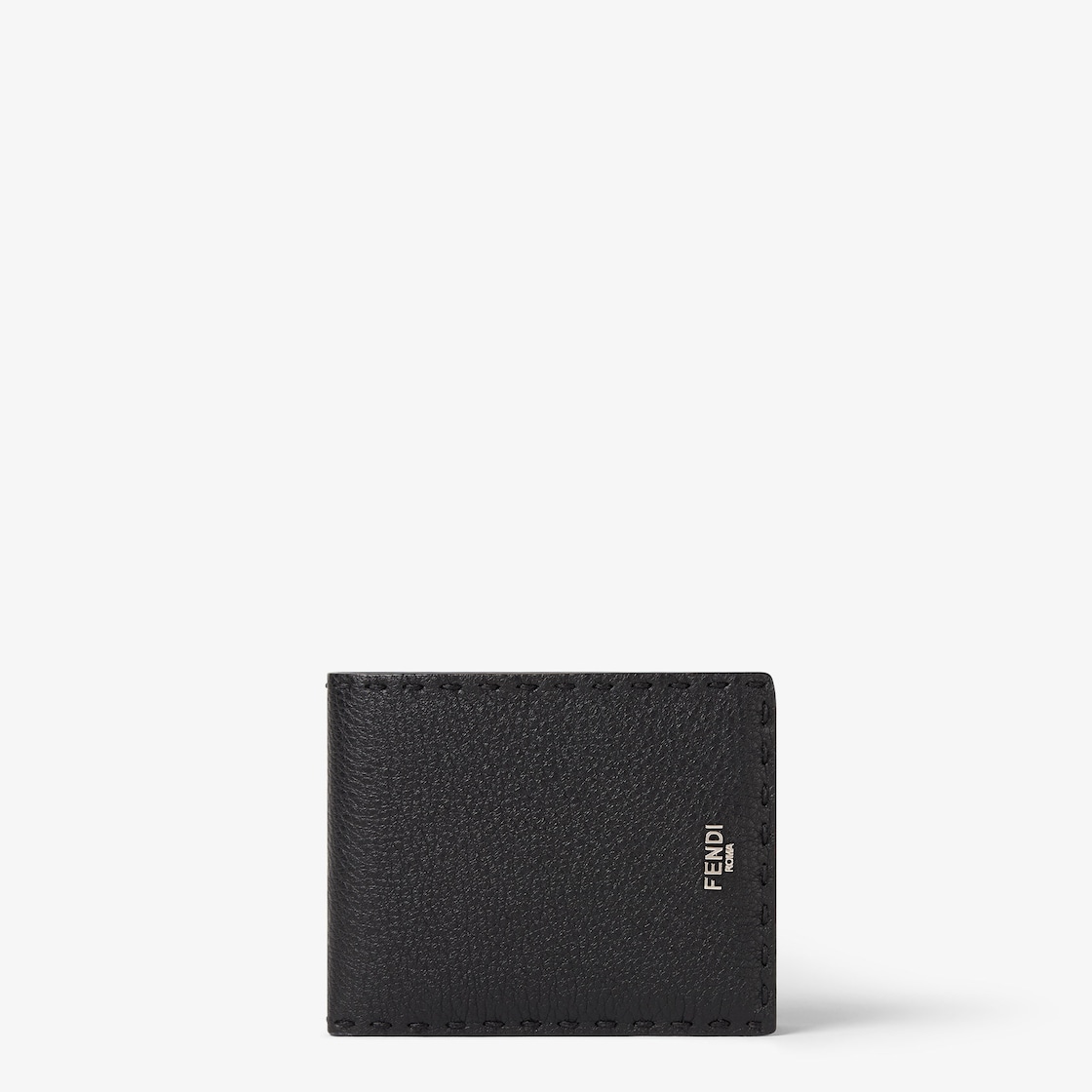Bi-fold wallet features four card slots, a pocket for banknotes and a practical coin compartment closed with a press stud. Made of black Cuoio Romano leather with 132 hand-sewn macro topstitches, an emblem of the iconic Selleria workmanship handed down through generations of Fendi artisans since 1925. Contrasting yellow leather lining. Metal Fendi Roma logo with a palladium finish.