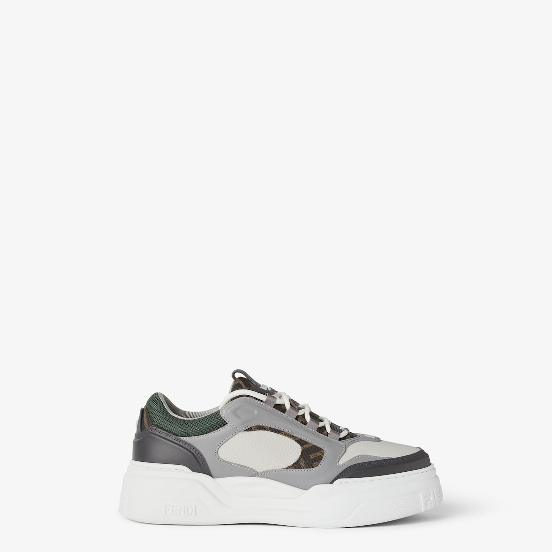 Fendi Force lace-up low-tops. Made of ice white full-grain leather with padded elements. Details in brown FF Jacquard, smooth grey leather and green technical fabric. Lightweight, chunky white soles with FF motif detail on the toe and heel.