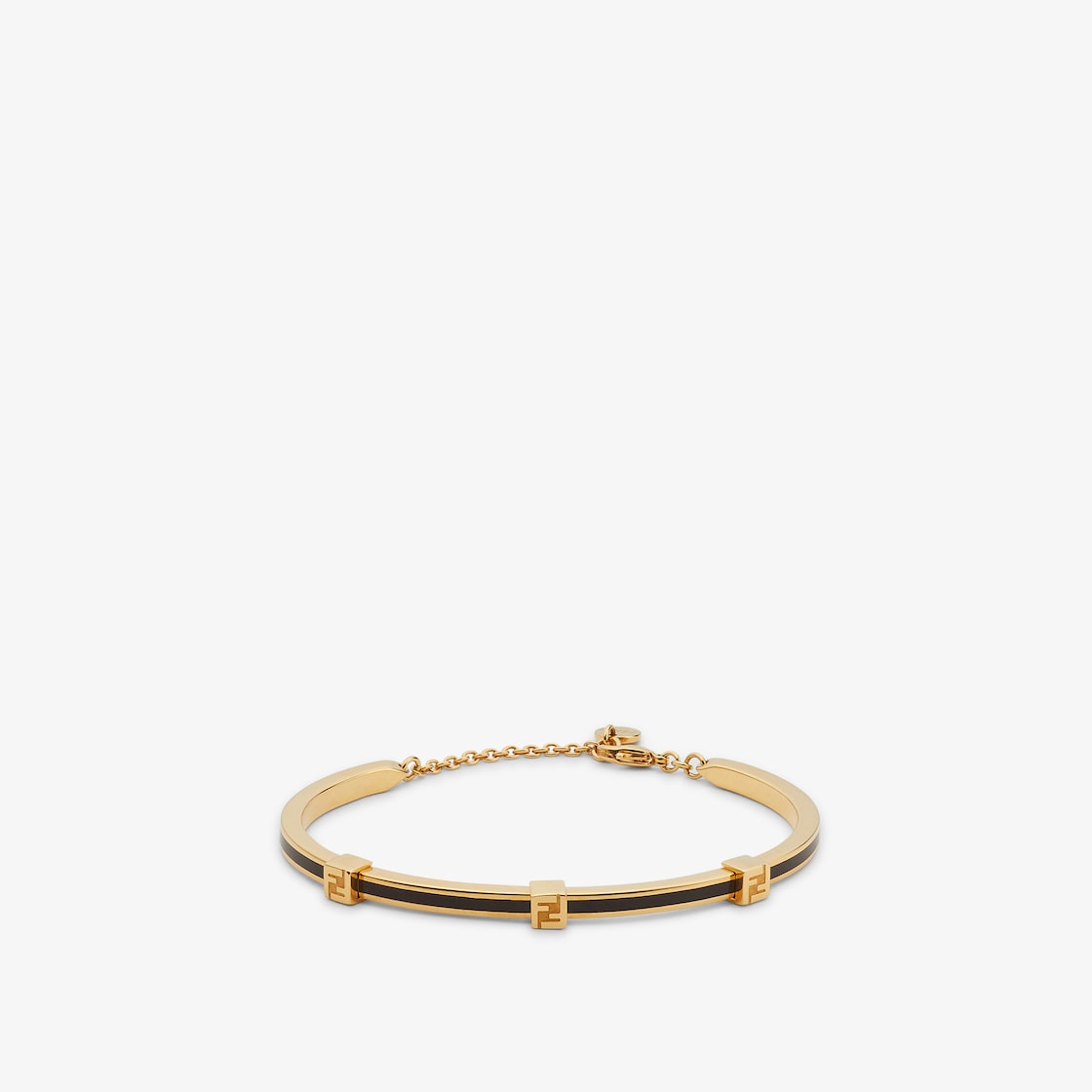 Slender, rigid bracelet with FF logo detail. Fine chain and snap hook clasp with logo tag. Made of gold-finish metal. Embellished with black enamelled details.