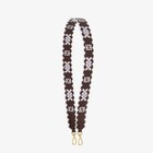 Long shoulder strap with double snap hook, to use in combination with any bag with hooks. Made of mahogany brown leather with contoured edges and openwork embroidery finished with contrasting lilac yarn. Gold-finish metalware.