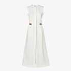 Sleeveless midi dress with fitted waist and flared skirt. Round neckline, side pockets and centre-front slit. Concealed front fastening. Made of white pure linen. Finished with side straps at the waist in tan leather with buckle and gold-finish metal logo button.